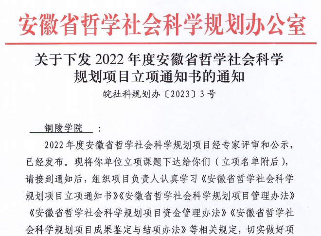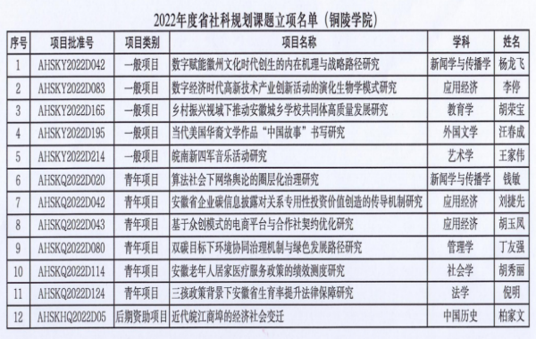 近日,安徽省哲学社会科学规划办公室发布了2022年度省哲学社会科学规划项目立项名单,我校获批立项12项。其中,青年项目6项,一般项目5项,后期资助项目1项,立项数位居全省同类高校前列。