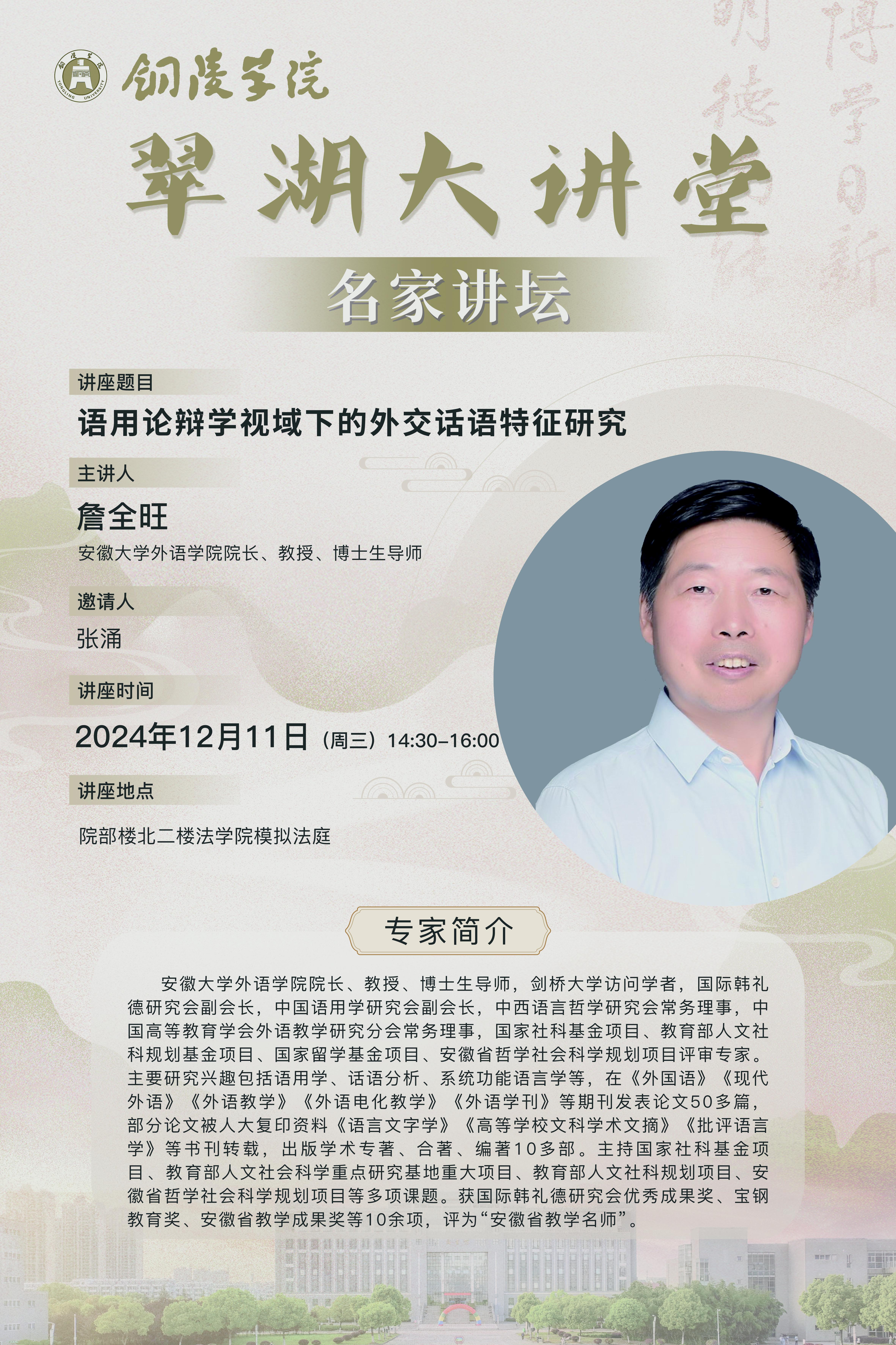 时间:2024年12月11日14:30-16:00;地点:铜陵学院翠湖校区院部楼北二楼法学院模拟法庭