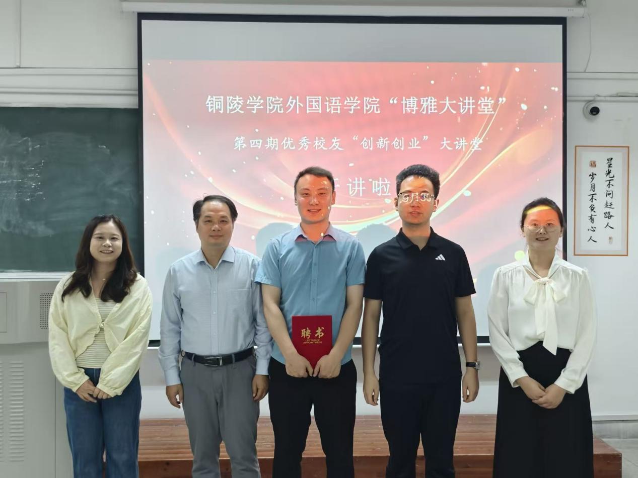 为发挥优秀校友示范作用,引导大一新生了解行业前沿信息,明确大学生涯规划,9月30日上午,外国语学院在育秀校区综合楼202教室举办第四期“博雅大讲堂”,邀请优秀校友作“创新创业”主题报告。外国语学院副院长汪春成、党委副书记张丽娟出席活动。2025级百余名学生参加报告会。报告会由张丽娟主持。