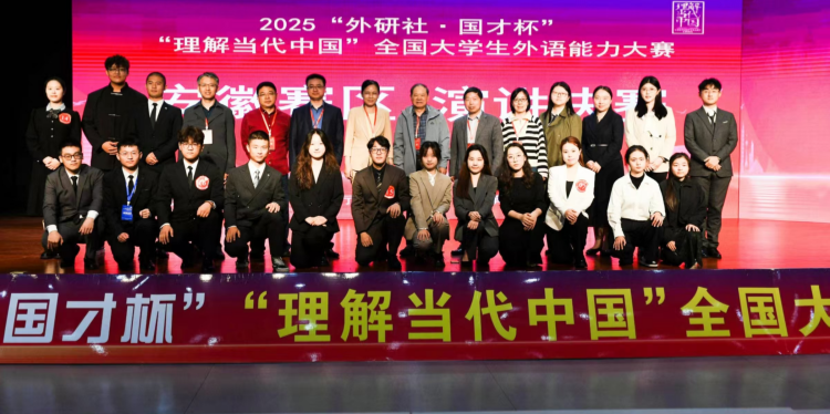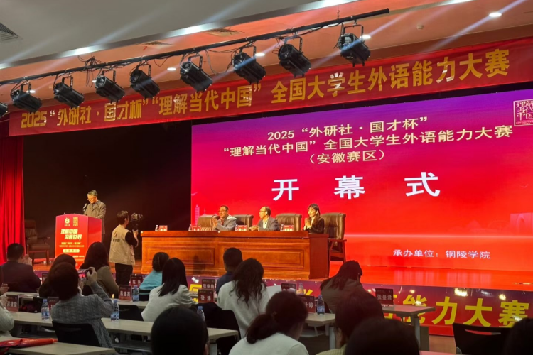 10月31日至11月2日,2025“外研社·国才杯”“理解当代中国”全国大学生外语能力大赛(安徽赛区)在我校举行。省教育厅高度重视,派员巡视指导。校党委委员、副校长疏仁华、省外国语言文学学会会长朱跃、外研社高等营销中心华中大区总经理翟嘉琪出席活动。共有来自47所本科院校的446名同学参加比赛。