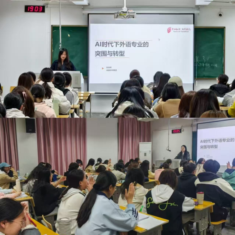 讲座聚焦“AI时代下外语专业的突围与转型”,李凌波、王芷璇两位行业导师结合自身在翻译技术、语言服务管理等领域的深厚积淀,系统解读了行业的前沿发展趋势,并聚焦“AI时代译者如何借助科技实现职业突围与转型”展开深度剖析。她们通过鲜活的案例,深入浅出地阐释了技术赋能在外语学习、学术科研及实践应用中的具体路径,为同学们清晰勾勒出新技术环境下外语人才的成长蓝图。