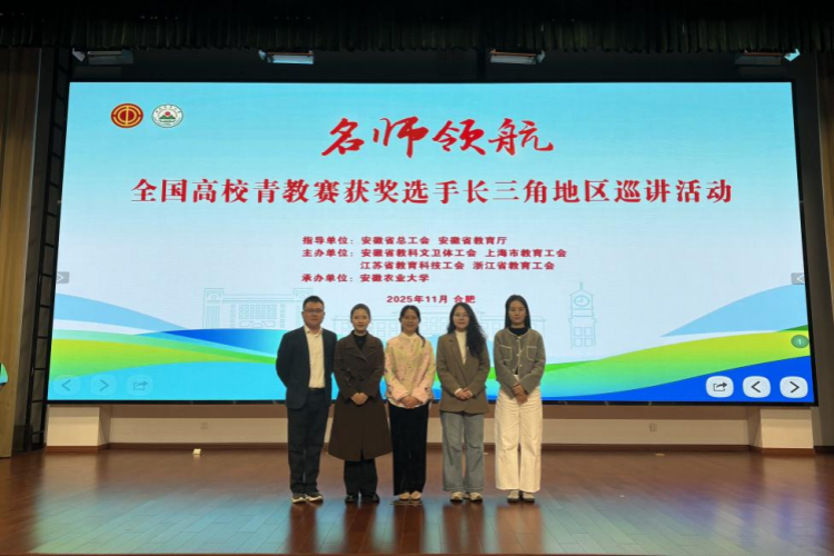 为深入贯彻落实全国教育大会精神,弘扬教育家精神,发挥教学竞赛示范引领作用,助力青年教师教学能力提升,11月11日,由安徽省教科文卫体工会、上海市教育工会、江苏省教育科技工会、浙江省教育工会联合主办、安徽农业大学承办的“名师领航”全国高校青教赛获奖选手长三角地区巡讲活动在合肥举办。我校工会、教务处组织四名青年教师现场观摩。