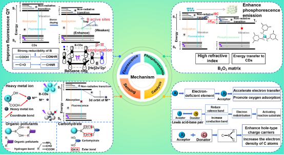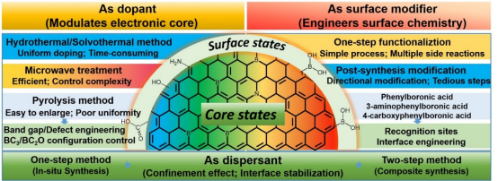 论文系统阐述了硼酸功能化碳点这一前沿领域的最新研究进展,首次深入剖析了硼酸作为掺杂剂、表面修饰剂和分散剂等不同功能化策略,揭示了硼酸功能化在提升碳点量子产率、增强传感选择性、优化催化性能及激发室温磷光等方面的作用机理,并展示了硼酸功能化碳点在环境监测、生物医学、信息安全和能源催化等领域的创新应用。其创新性提出了硼酸功能化碳点的多级调控机制,为实现碳点性能的按需设计提供了重要理论基础。还展望了该领域闭环智能诊疗系统、新能源应用和神经形态计算等前沿交叉领域未来发展方向。论文成果为新一代高性能碳基功能材料的开发提供了重要理论指导和技术路径,对推动纳米材料在多个交叉学科领域的发展具有重要意义。