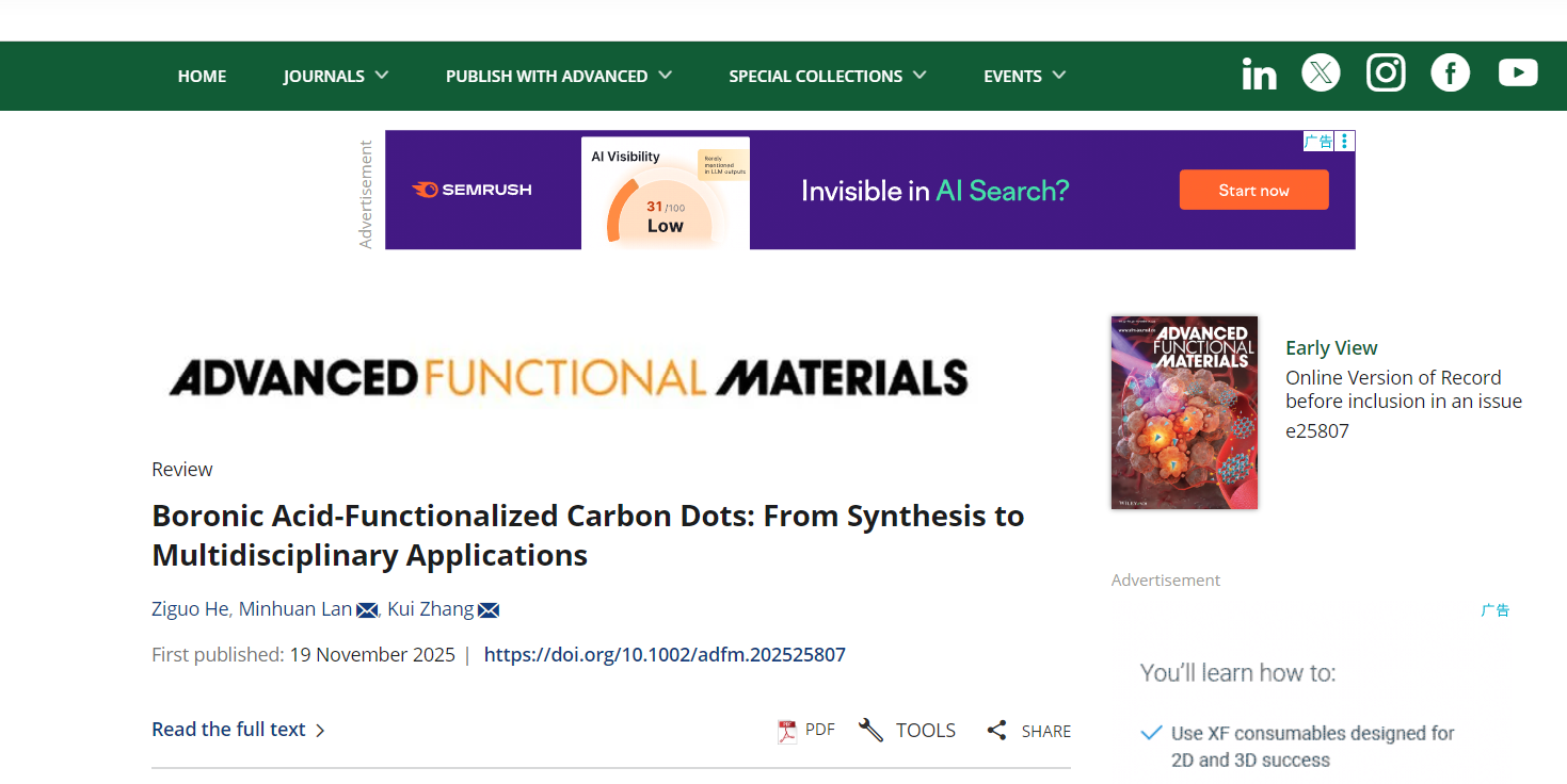 近日,我校青年教师何自国博士以第一作者身份在国际顶级期刊《Advanced Functional Materials》(中科院一区,Top期刊,影响因子19)上发表题名为“Boronic Acid-Functionalized Carbon Dots: From Synthesis to Multidisciplinary Applications”的高水平综述论文,我校为论文第一单位。
