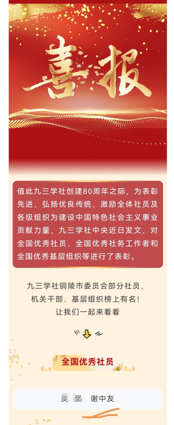 在九三学社创建80周年之际,为表彰先进、弘扬优良传统,激励全体社员及各级组织为建设中国特色社会主义事业贡献力量,九三学社中央近日发文,对全国优秀社员、全国优秀社务工作者和全国优秀基层组织等进行了表彰。九三学社社员、九三学社铜陵学院基层组织主要负责人、我校建筑工程学院教授、博士谢中友老师榜上有名,被评为“全国优秀社员”。