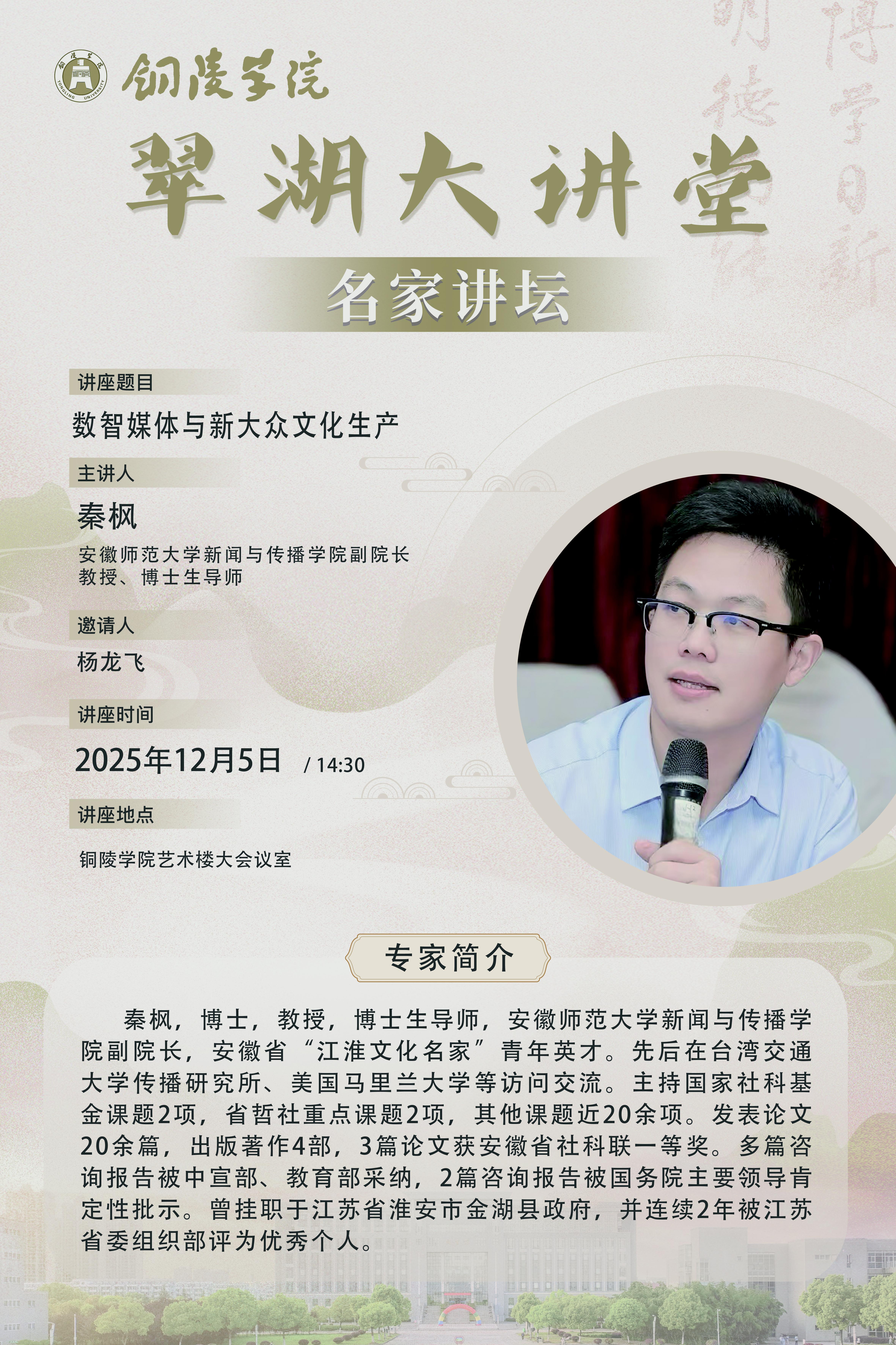 时间:12月5日14:30;地点:铜陵学院翠湖校区艺术楼大会议室
