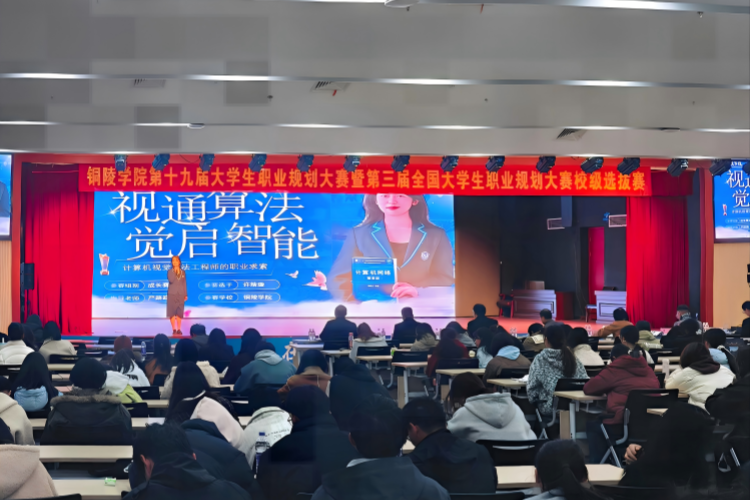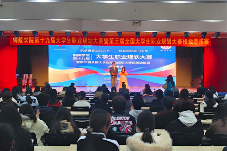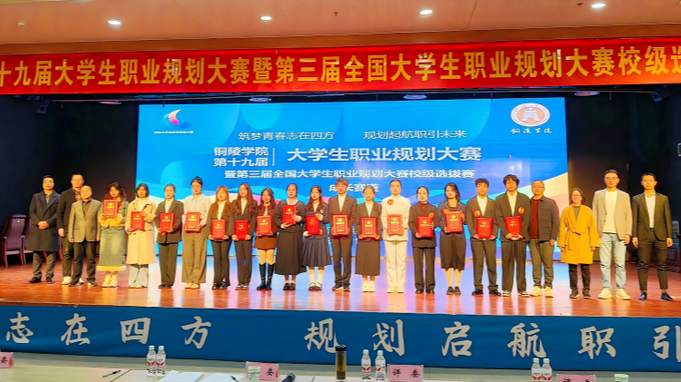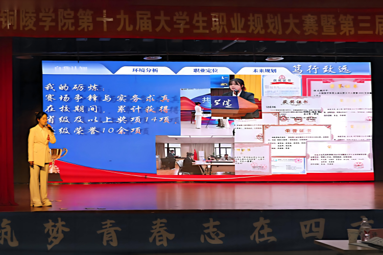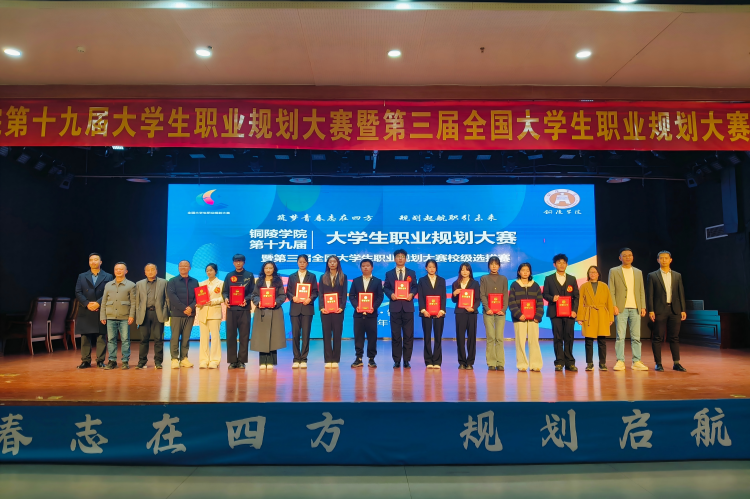 11月29日,铜陵学院第十九届大学生职业规划大赛暨第三届全国大学生职业规划大赛校级选拔赛决赛在翠湖校区“一站式”学生社区综合服务中心二楼报告厅顺利举办。经过各学院初审选拔的18名成长赛道选手、13名就业赛道选手参加比赛。各二级学院分管学生工作负责人、参赛指导教师、300多名师生代表现场观摩比赛。