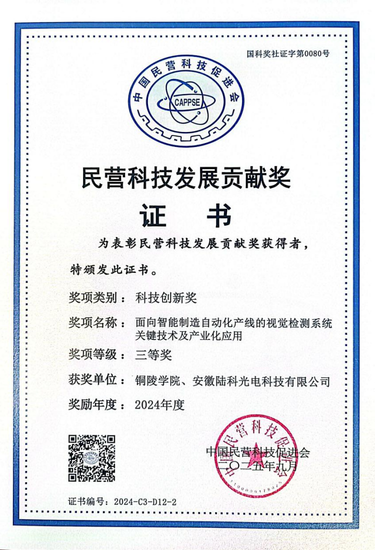 近日,由我校数学与计算机学院齐平、李腾等老师团队与安徽陆科光电科技有限公司联合攻关的“面向智能制造自动化产线的视觉检测系统关键技术及产业化应用”项目,荣获中国民营科技促进会科技创新奖三等奖,彰显了我校在智能检测领域的实力。