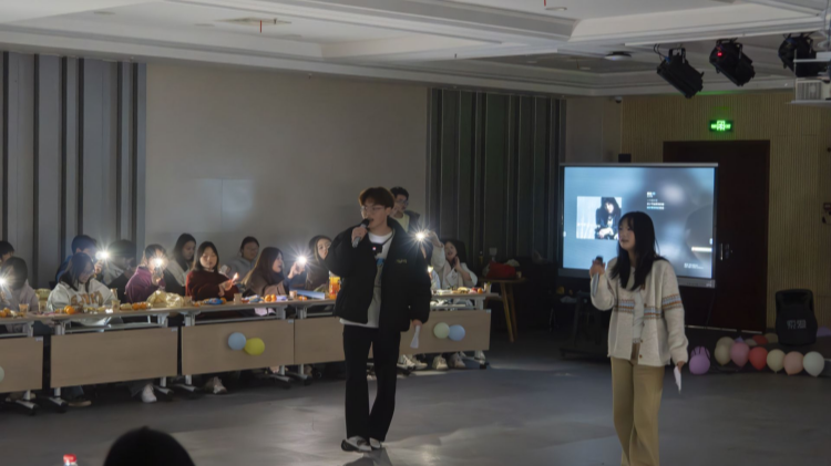 活动中,2025级同学们依次上台,用生动活泼的语言介绍个人兴趣爱好与学业规划,并推介家乡、表演才艺:来自山东青岛的同学分享了海滨城市的特色海鲜与啤酒文化,海风气息扑面而来;安徽亳州的同学不仅介绍了古井贡酒、华佗故里等家乡名片,更以一段爆笑小品《亳州丧宴叨菜记》引爆全场,幽默的台词与生动的表演赢得阵阵掌声与欢笑;广东同学则带领大家领略粤式早茶的精致与粤语的韵味;江西同学通过庐山风光与瓦罐汤的讲述,展现赣地风情。一个个精彩的展示与表演,如同一场生动的“云端旅行”,让师生们沉浸其中,也在轻松愉快的氛围中拉近了彼此的距离。