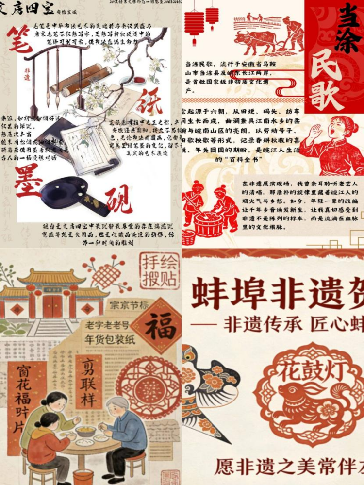 语言与传播学院学子在返家乡实践中解锁非遗传承,用青春创意赓续乡土文脉。回到宣城,她们将文房四宝的笔墨雅韵凝于手帐,细致梳理非遗渊源;在马鞍山当涂,他们以图文记录当涂民歌的皖江腔调,让乡音跃然纸上;在蚌埠,他们整理蚌埠非遗技艺的同时还制作马年新年贺卡,让非遗与年味交融…… 为探寻皖韵非遗魅力,学子们以手帐为媒,在创作中读懂非遗,让皖风文脉在青春笔触下焕发新生。