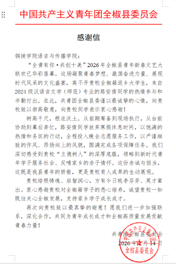 近日,共青团全椒县委员会向我校语言与传播学院发《感谢信》,感谢我校2024级汉语言文学(师范)专业学生路安倩在该县青年新春文艺大联欢活动中的突出表现,充分肯定我校育人成果。