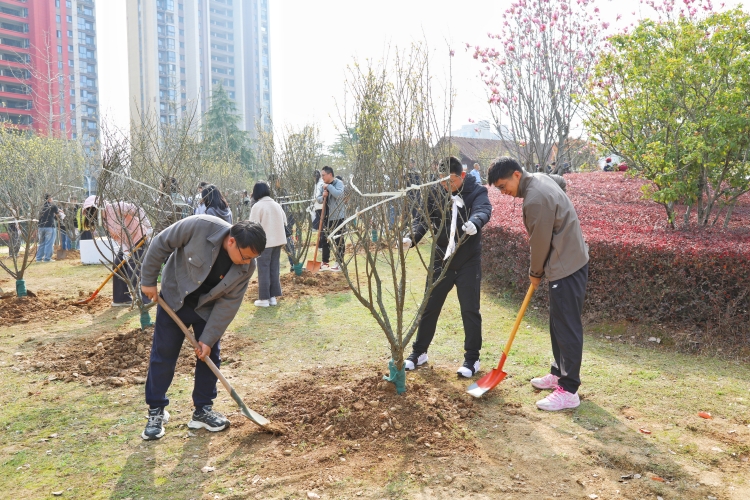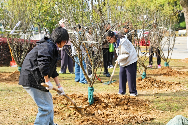 下午3时整,植树活动正式启动。参与活动的师生党员们有序领取铁锹、水桶、手套等工具。校领导率先垂范,拿起工具投入到植树劳动中,大家以3人为一组,分工明确、配合默契,按照技术规范扶苗、填土、踩实、浇水。劳动过程中,校领导与学生亲切交谈,细致询问大家的学习生活、专业实践与思想成长情况,勉励同学们要将生态文明理念内化于心、外化于行,在日常学习生活中践行绿色低碳,主动担当校园生态建设的参与者与守护者。现场气氛热烈融洽,欢声笑语不断。