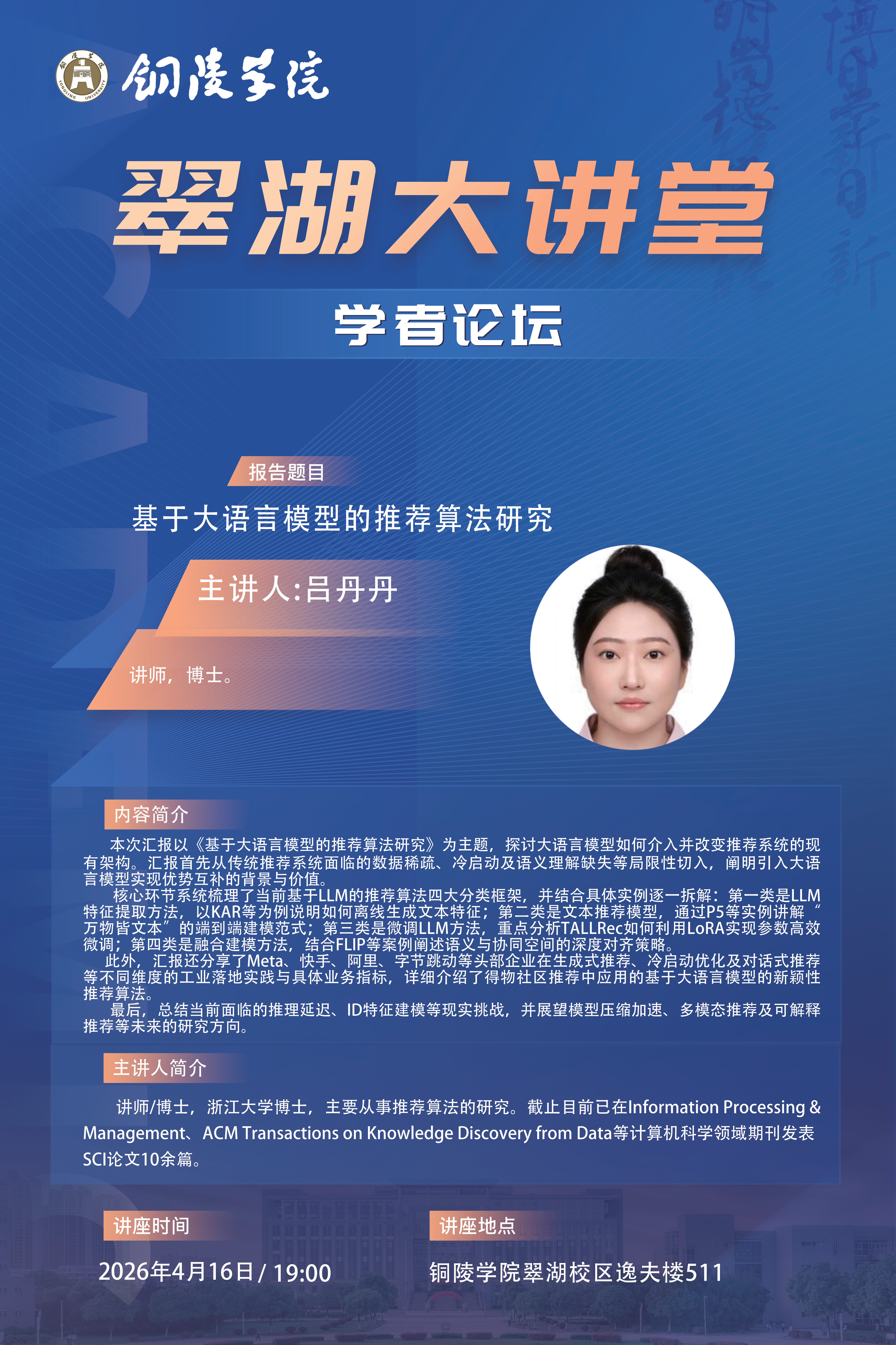 时间:4月16日19:00;地点:翠湖校区逸夫楼511