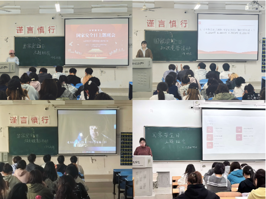 学院立足学科优势,精准设计教育内容,推动国家安全教育走深走实。汉语言文学专业组织《护航之道》国家安全主题纪录片观影活动,引导学生在光影叙事中感悟隐蔽战线的忠诚与担当;网络与新媒体专业举办“国安知识我来答”趣味竞答活动,围绕《国家安全法》《网络安全法》《反间谍法》等法律法规设置抢答题,现场气氛热烈;英语专业则聚焦涉外安全,结合“国家安全 你我同行”主题班会,通过系统讲解政治安全、文化安全、生态安全等核心内涵,强化学生在跨文化交流中的国家安全防范意识,彰显“外语+安全”的育人特色。