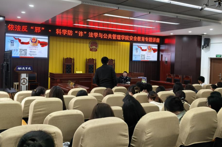 为深入贯彻落实总体国家安全观,切实增强学生识邪、防邪、拒邪及反诈防骗能力,4月15日,法学与公共管理学院团委在模拟法庭举办“依法反‘邪’·科学防‘诈’”安全教育专题讲座,特邀新城派出所民警陈天昊担任主讲人,学院辅导员和近百名学生代表参加。