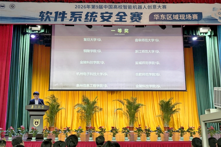 4月19日,2026年第九届中国高校智能机器人创意大赛产教融合赛道——软件系统安全赛华东区域现场赛在南京大学鼓楼校区圆满落幕。我校人工智能学院任良好、王平、刘明宇、邹梦奇等四位同学组成的代表队(指导教师:束红、陈明)荣获赛区第三名,成功晋级全国总决赛。