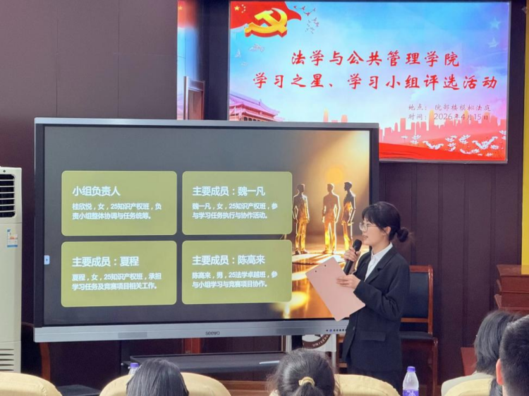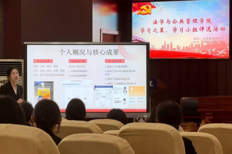 为深化专业学习成效,营造互帮互鉴、积极向上的优良学风,法学与公共管理学院开展2026年学风建设先进典型评选活动。4月15日下午,评选活动在院部楼模拟法庭圆满落幕,评选出学习方法创新、学习成效突出、示范带动作用明显的“学习小组”“学习之星”。