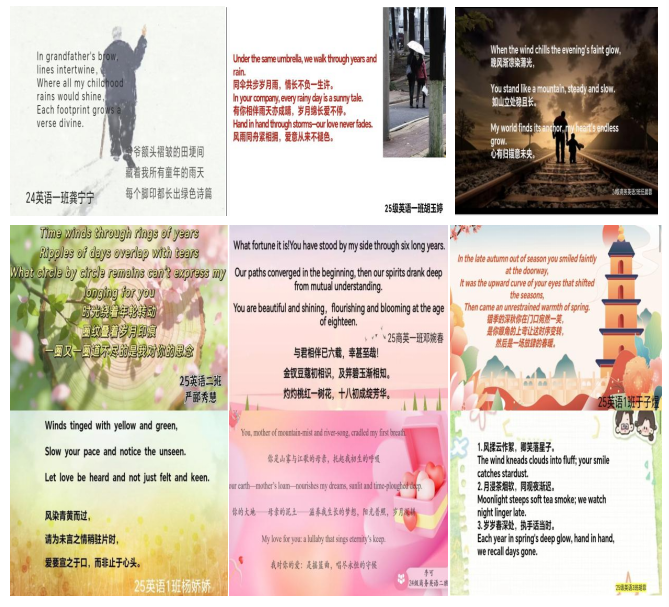 在作品展示环节,获奖同学将文字与视觉艺术相结合,利用特效PPT、背景音乐与动态效果,把静态诗句转化为富有感染力的视听作品。这些作品通过学院新媒体平台集中展示,简洁文字与精美PPT相辅相成,传递出温暖力量,引发广泛共鸣。