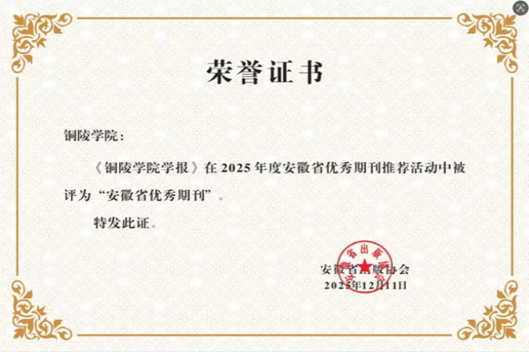 近日,安徽省出版协会公布2025年度安徽省优秀期刊评选结果,我校《铜陵学院学报》凭借扎实的办刊质量、鲜明的办刊特色及突出的学术影响力,获评“安徽省优秀期刊”称号。