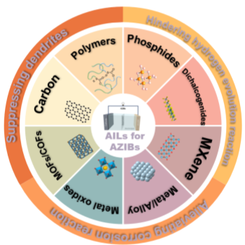 该论文系统总结了用于锌离子电池性能调控的人工界面层(AILs)的基本原理、设计策略与电化学性能。论文中,作者简要探讨了锌离子电池的副反应及其电化学机制,系统梳理了人工界面层的分类、组成、结构特征、合成方法及电化学机理,重点分析了基于内在电化学过程的锌负极与人工界面层之间的相互作用机制,并展望了人工界面层在锌离子电池未来发展中的应用前景,为新一代锌离子电池电极材料的开发提供了重要理论指导,对推动水系锌离子电池的研究和商业化具有重要意义。