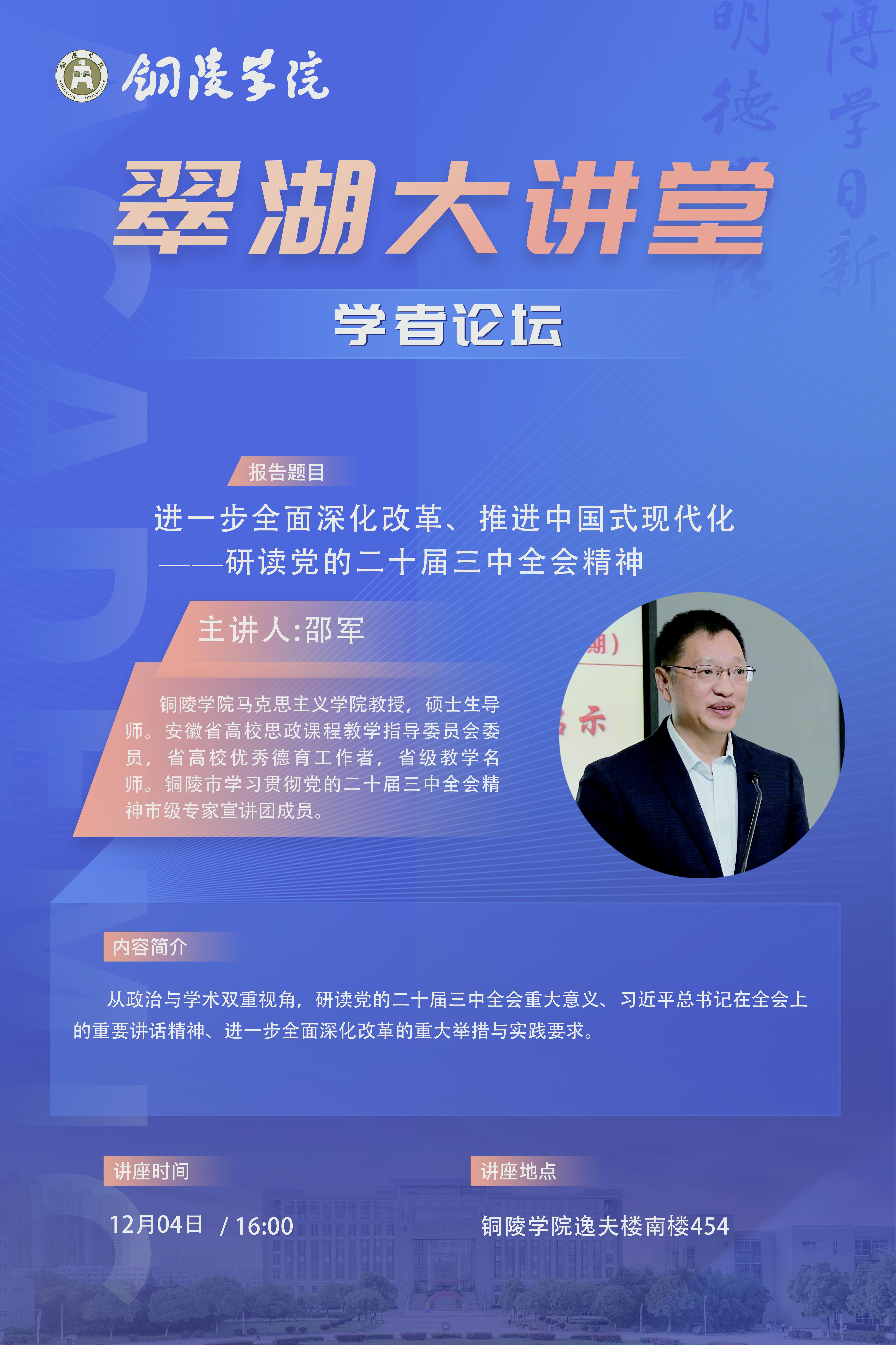 时间:2024年12月4日16:00;地点:铜陵学院翠湖校区逸夫楼南楼454