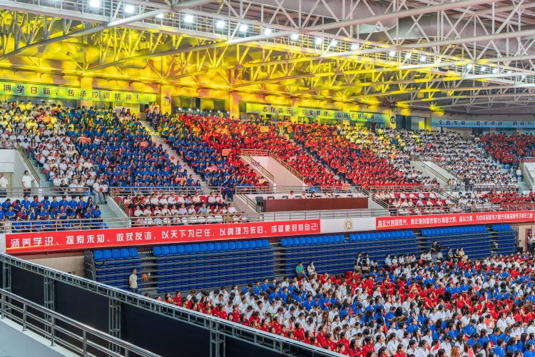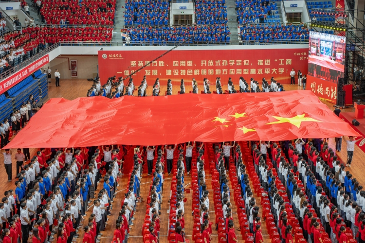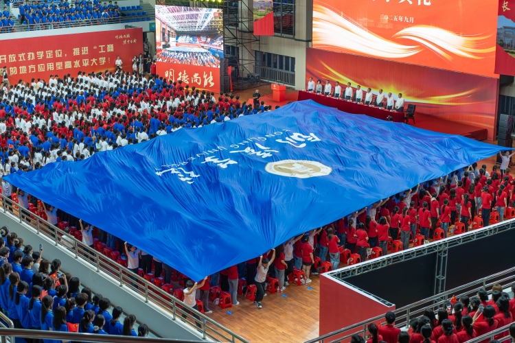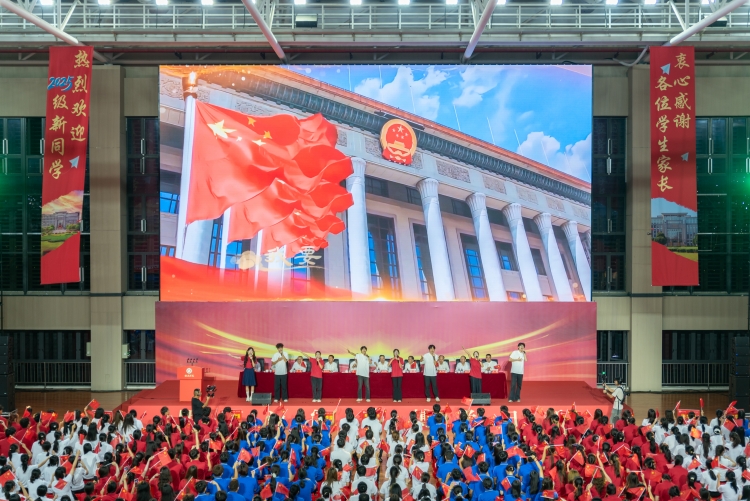 在全场师生《我和我的祖国》的深情歌声中,一面巨幅国旗庄严展开,在新生代表手中接力传递,青春的脉搏与国旗的鲜红同频共振,瞬间点燃了全场的热血与激情!而新生代表亲手迎接的校旗,不仅是一份厚重责任的传递,更是一段崭新征程的启航。