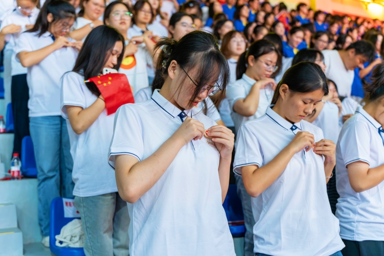 主席台就座的领导和嘉宾还为新生代表佩戴了校徽。全体2025级新生集体佩戴校徽。一日铜院人,一生铜院情。校徽佩戴胸前,是成为一名铜院人的标志,全体新生必将以“铜院人”的新身份,不负韶华,砥砺前行,续写青春华章。